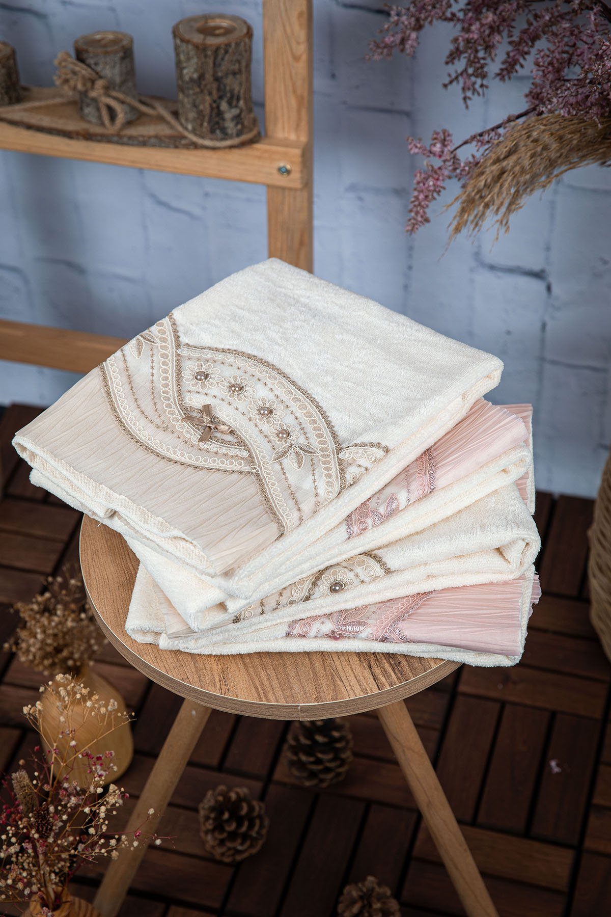 %100 Pamuk Fiyonk Güpürlü Çeyizlik 4lü Havlu 50x90 - Pudra - Vizon