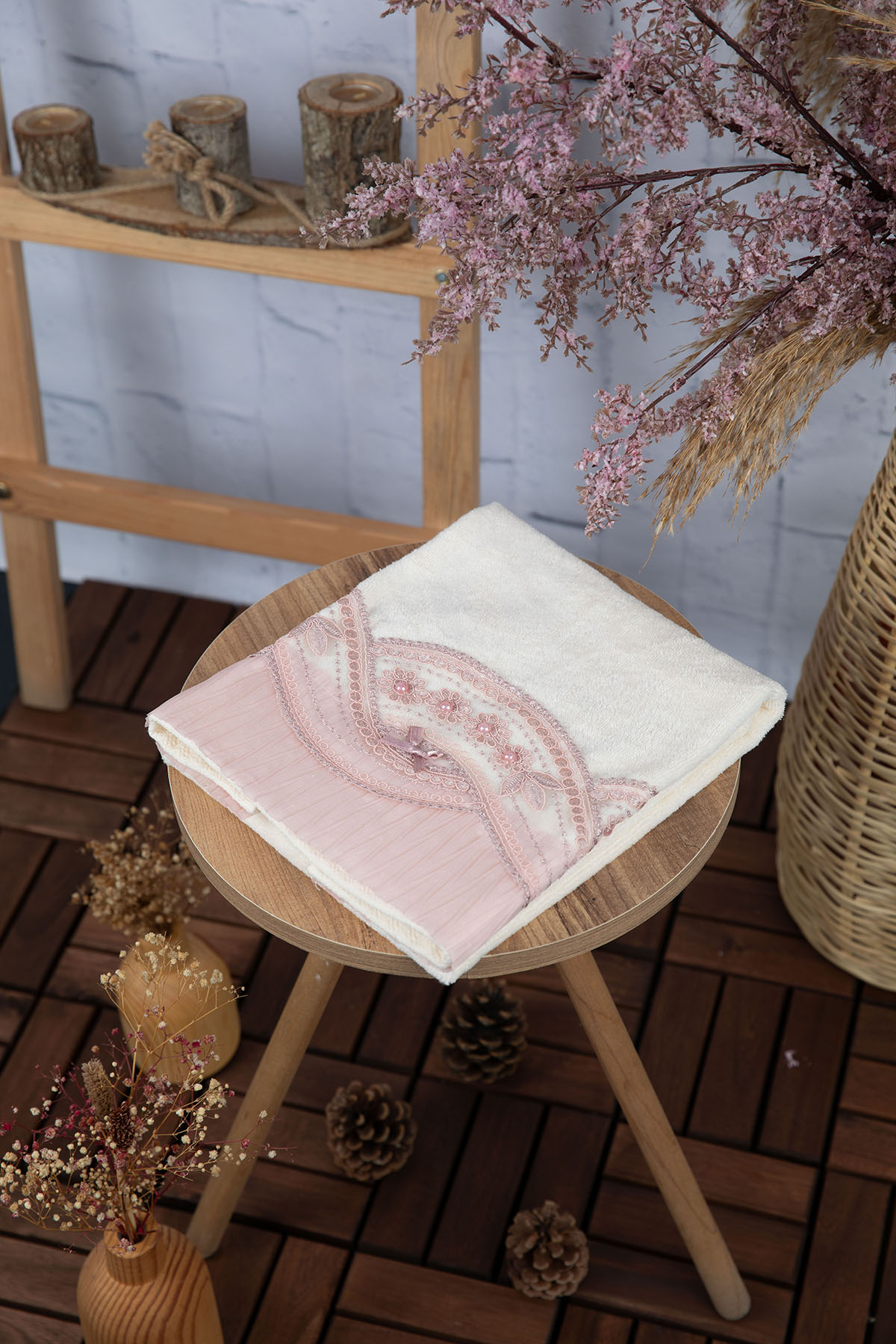 %100 Pamuk Fiyonk Güpürlü Çeyizlik Havlu 50x90 - Pudra