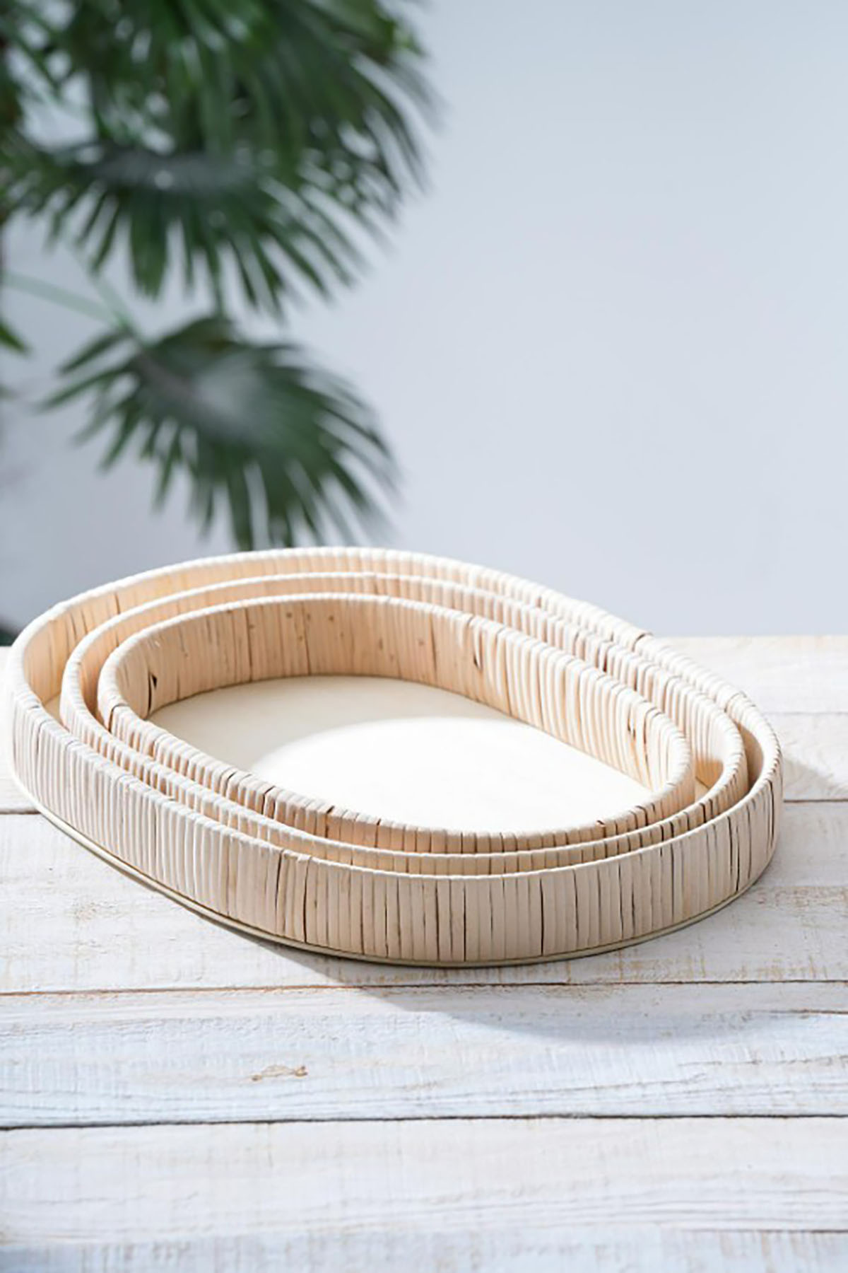 Acar Oval Hasır Tepsi Seti, doğal hasır dokusuyla sofralarınıza ve yaşam alanlarınıza sıcak bir dokunuş katıyor. 3 farklı boyuttaki oval tepsiler, kahvaltıdan çay saatlerine, servis sunumlarından dekoratif amaçlara kadar geniş kullanım imkanı sunar.