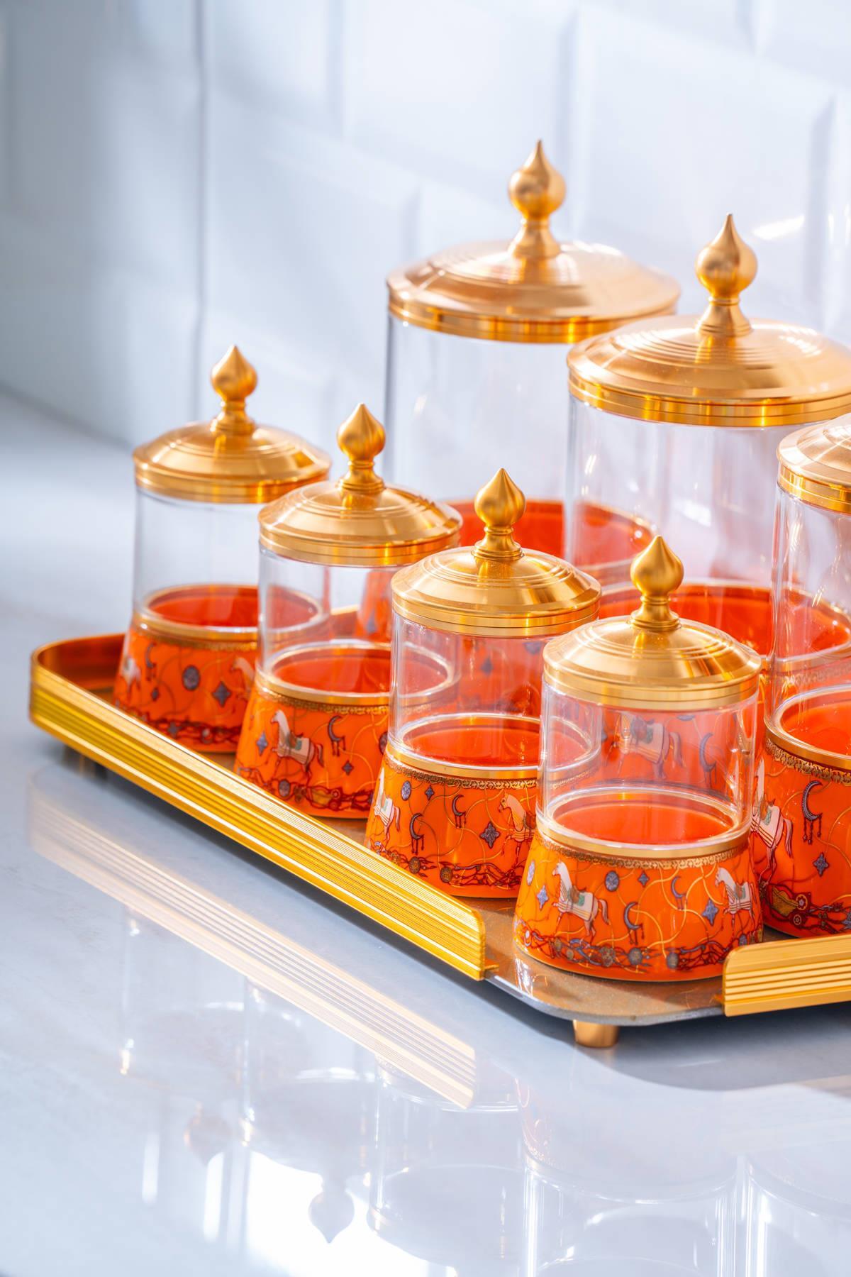 3 adet büyük kavanoz: 18 x 10,5 x 10,5 cm 4 adet küçük kavanoz: 11,5 x 7 x 7 cm 1 adet cam tepsi: 35,5 x 21 x 3 cm