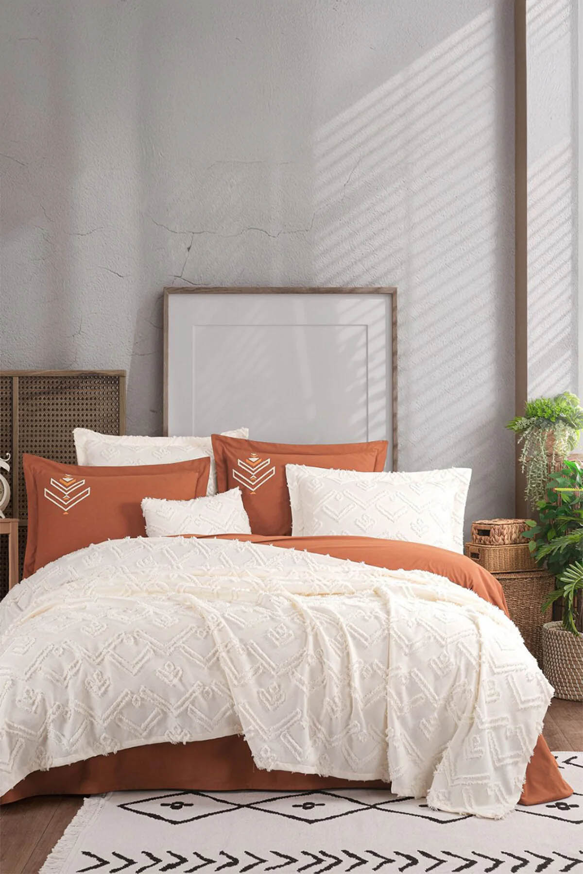 İyi Geceler Aztec Çift Kişilik Yatak Örtüsü Seti, yatak odanıza doğal bir şıklık ve modern bir dokunuş kazandırır. Krem rengi ve Aztec esintili deseni sayesinde sade ama dikkat çekici bir görünüm sunar. %100 pamuk dokusu, nefes alabilir ve yumuşak yapısıyla konforlu bir uyku deneyimi sağlar, aynı zamanda dört mevsim kullanım için idealdir.