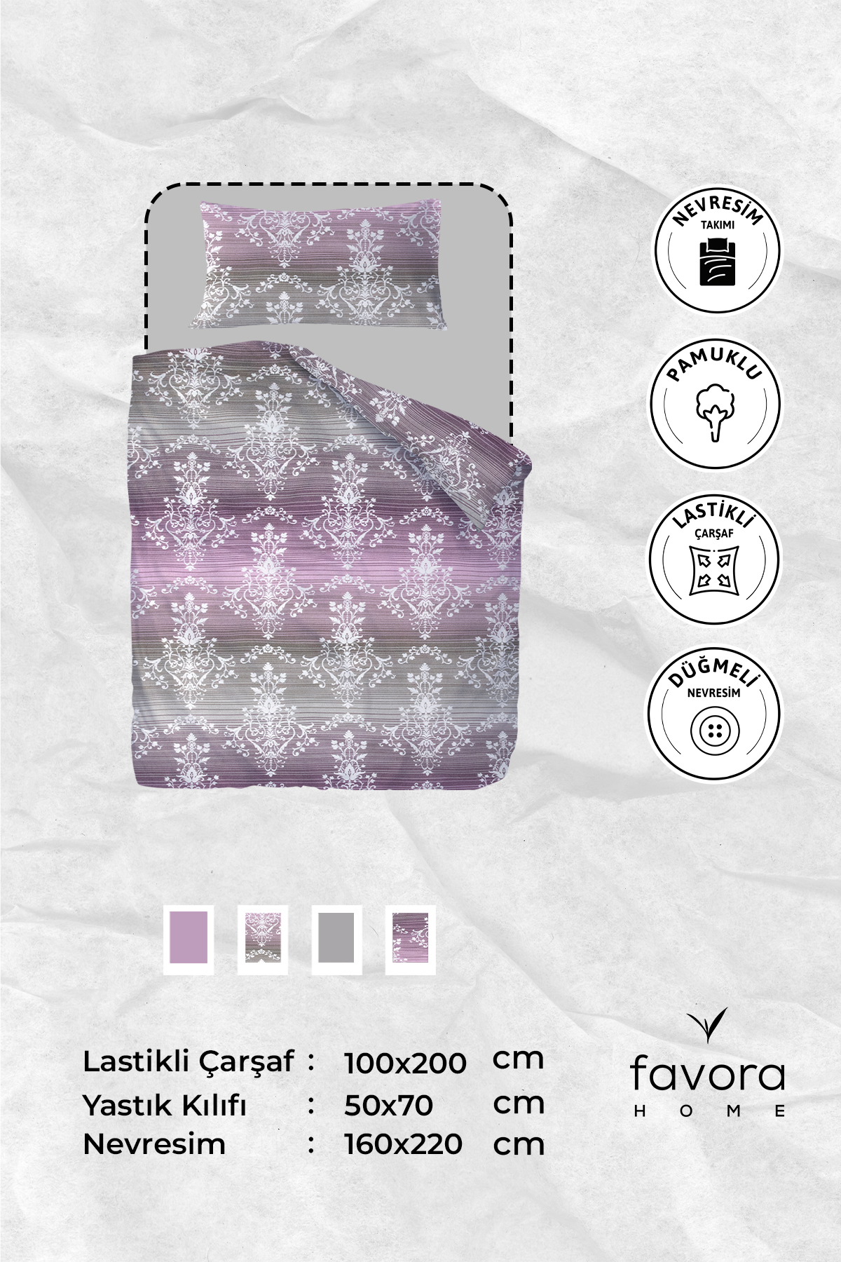 Yatak odanıza yeni bir soluk getirecek ve her gece rahat bir uyku deneyimi yaşatacak ürünler Favora Home’da! Mükemmel renk uyumu ve kalitesi, size rahat bir uyku sağlarken yatak odanızın modern bir görünüme sahip olmasını sağlayacaktır. Favora Home nevresim takımı, hem görsel olarak etkileyici hem de işlevsel bir seçenek olarak öne çıkar. Lastikli çarşaf özelliği sayesinde yatağınızı kolayca kavrayarak pratik kullanım sunar. Kaliteli malzemesi ve detaylarıyla evinizin konforunu ve stilini tamamlamak için mükemmel bir seçimdir.