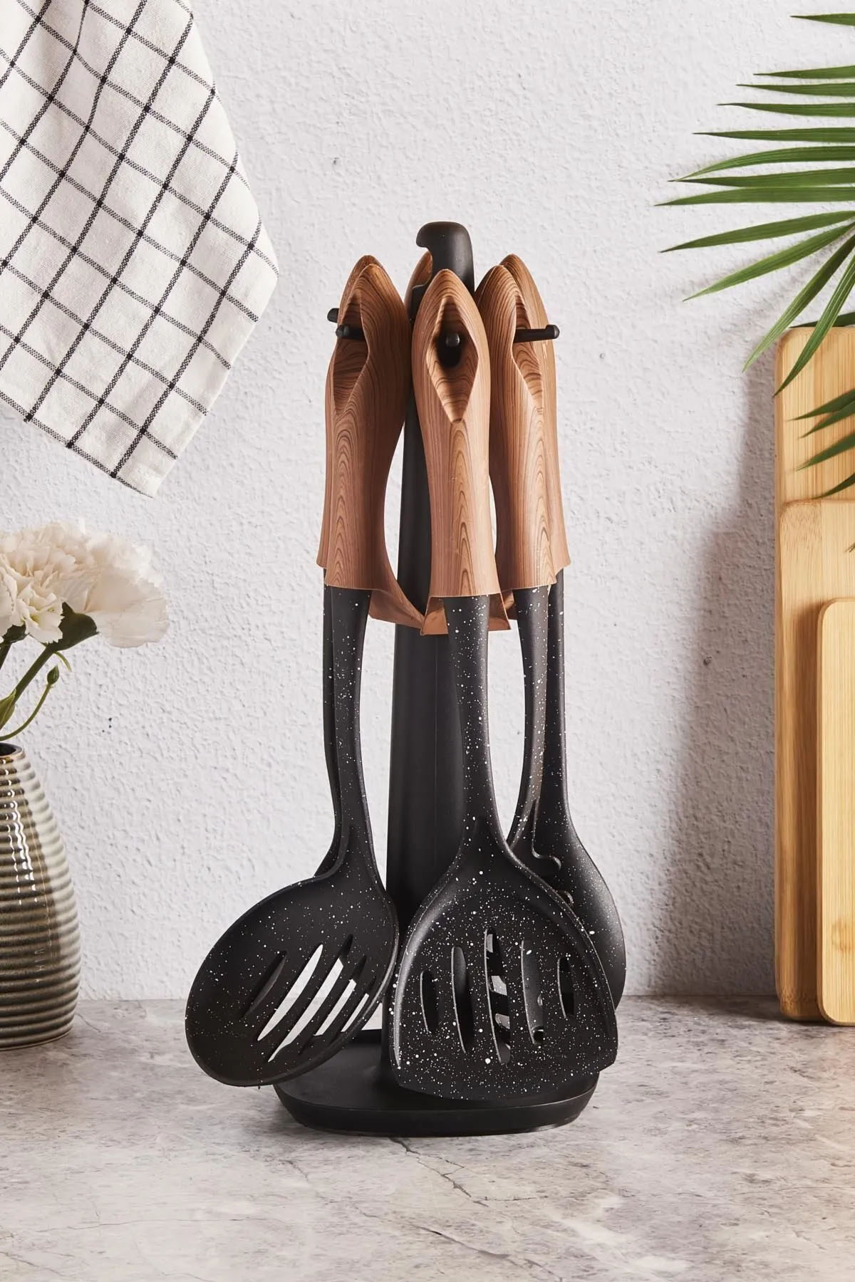Set içerisindeki 6 farklı mutfak gereci; ısıya dayanıklı, yapışmaz yüzeylere zarar vermeyen özel plastikten üretilmiştir. Ergonomik ahşap desenli sapları sayesinde rahat bir tutuş sağlar. Dönebilen şık standı sayesinde tüm parçaları düzenli şekilde muhafaza edebilir, ihtiyacınız olan gerece kolayca ulaşabilirsiniz.