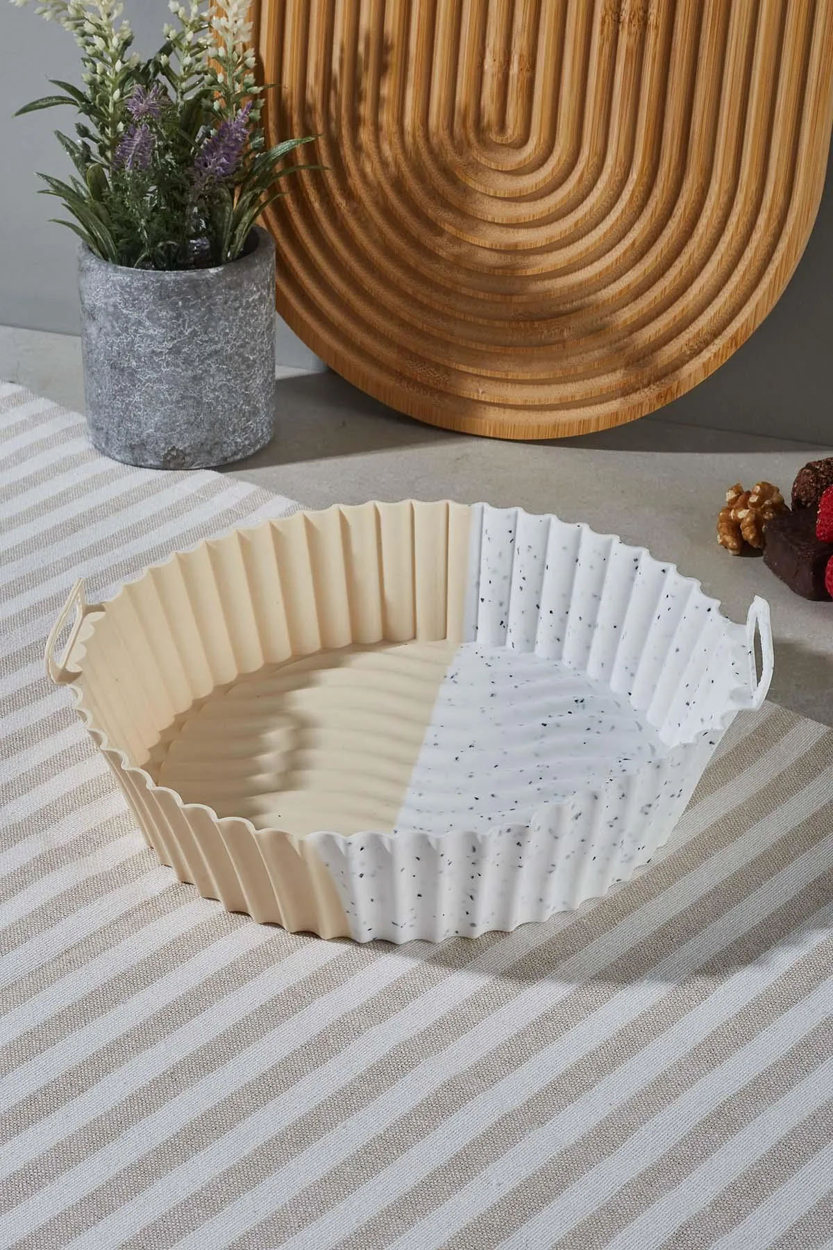 Airfryer kullanımını daha hijyenik ve pratik hale getiren bu silikon pişirme kabı, yüksek ısıya dayanıklı yapısıyla öne çıkar. Sıcak hava fritözlerinde kızartma, ısıtma ve pişirme işlemlerinde konfor sunar. Esnek formu sayesinde cihazınıza tam uyum sağlar; yiyeceklerin yapışmasını önleyerek kolayca çıkarılmasına yardımcı olur.