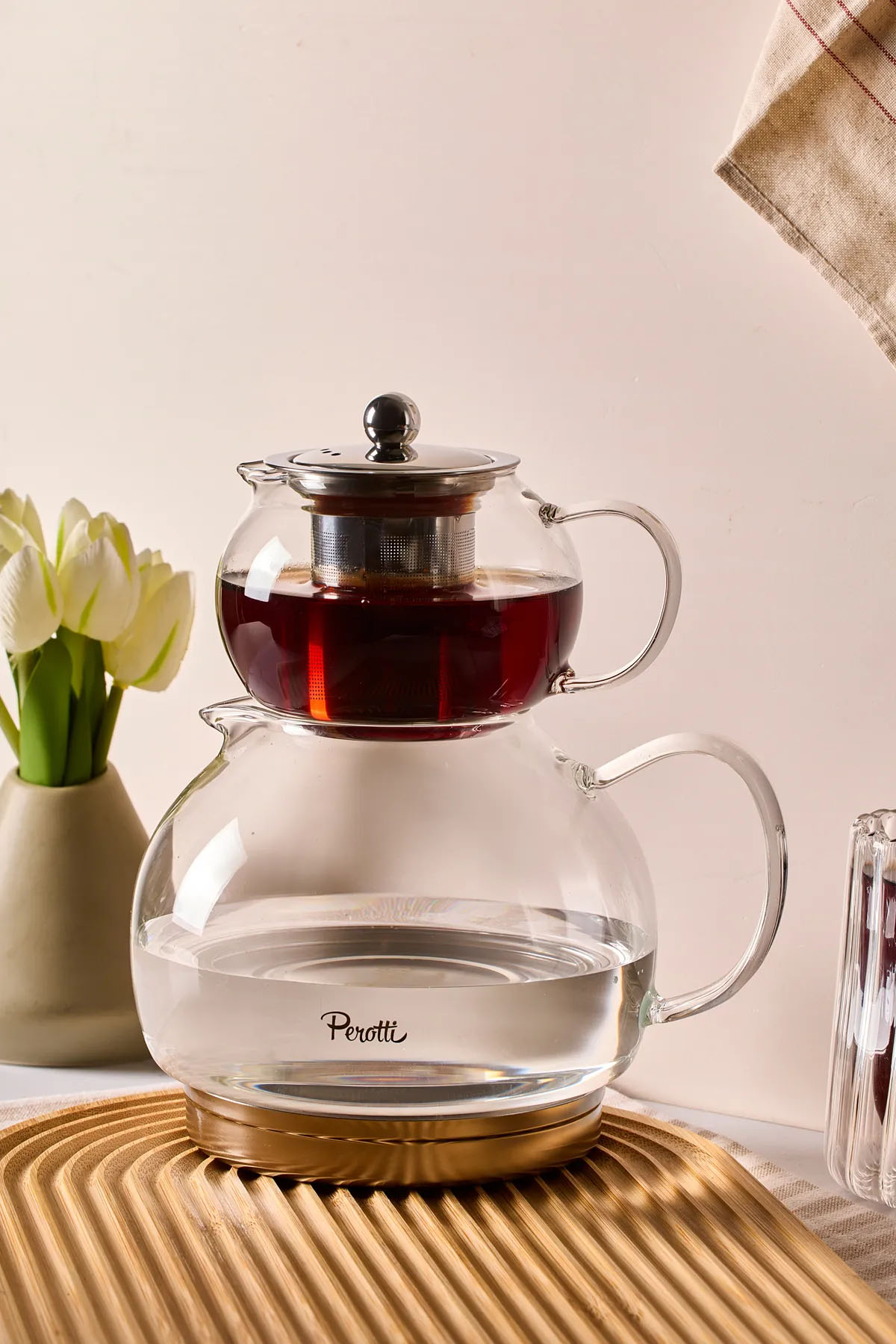 Dayanıklı borosilikat cam malzemeden üretilen bu şık çaydanlık, yüksek ısıya karşı direnç göstererek çay demleme sürecini güvenli ve keyifli hale getirir. Şeffaf tasarımı sayesinde çayın rengini ve kıvamını rahatlıkla izleyebilir, her fincanda ideal lezzeti yakalayabilirsiniz.