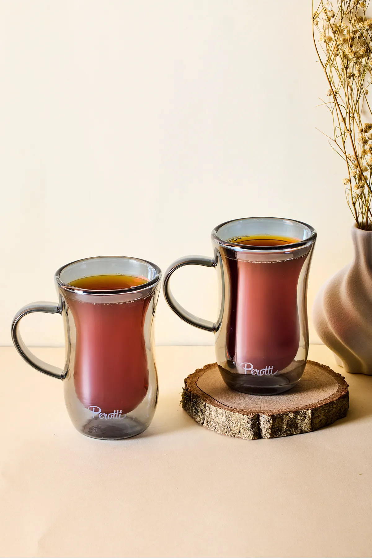 Perotti 2’li çift cidarlı çay bardağı seti, 150 ml kapasitesi ve füme renkli cam tasarımıyla modern ve şık bir çay deneyimi sunar. Çift cidarlı yapısı, çayın sıcaklığını uzun süre koruyarak keyfinizin bölünmemesini sağlar; aynı zamanda dış yüzeyin elde sıcaklık hissi yaratmasını önler. Füme tonları, sofralarınıza sofistike ve zarif bir dokunuş katarken, camın şeffaflığı ile içeceğinizin rengini estetik bir şekilde ortaya çıkarır.