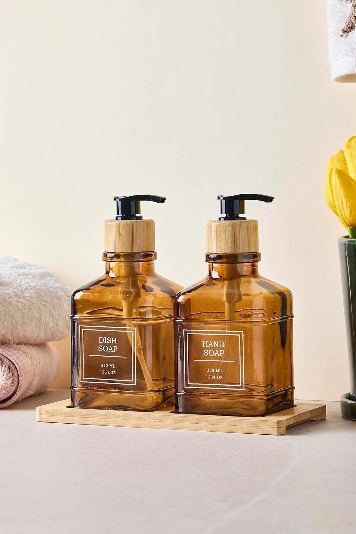 Amber renkli cam şişeleriyle tasarlanmış bu 2’li sıvı sabunluk seti, banyonuza veya mutfağınıza sıcak ve şık bir dokunuş katar. Her biri ideal kapasitede olan sabunluklar, sıvı sabunlarınızı düzenli ve hijyenik şekilde saklamanıza olanak tanır. Kompakt yapısı, tezgahınızda fazla yer kaplamadan pratik bir kullanım sağlar.