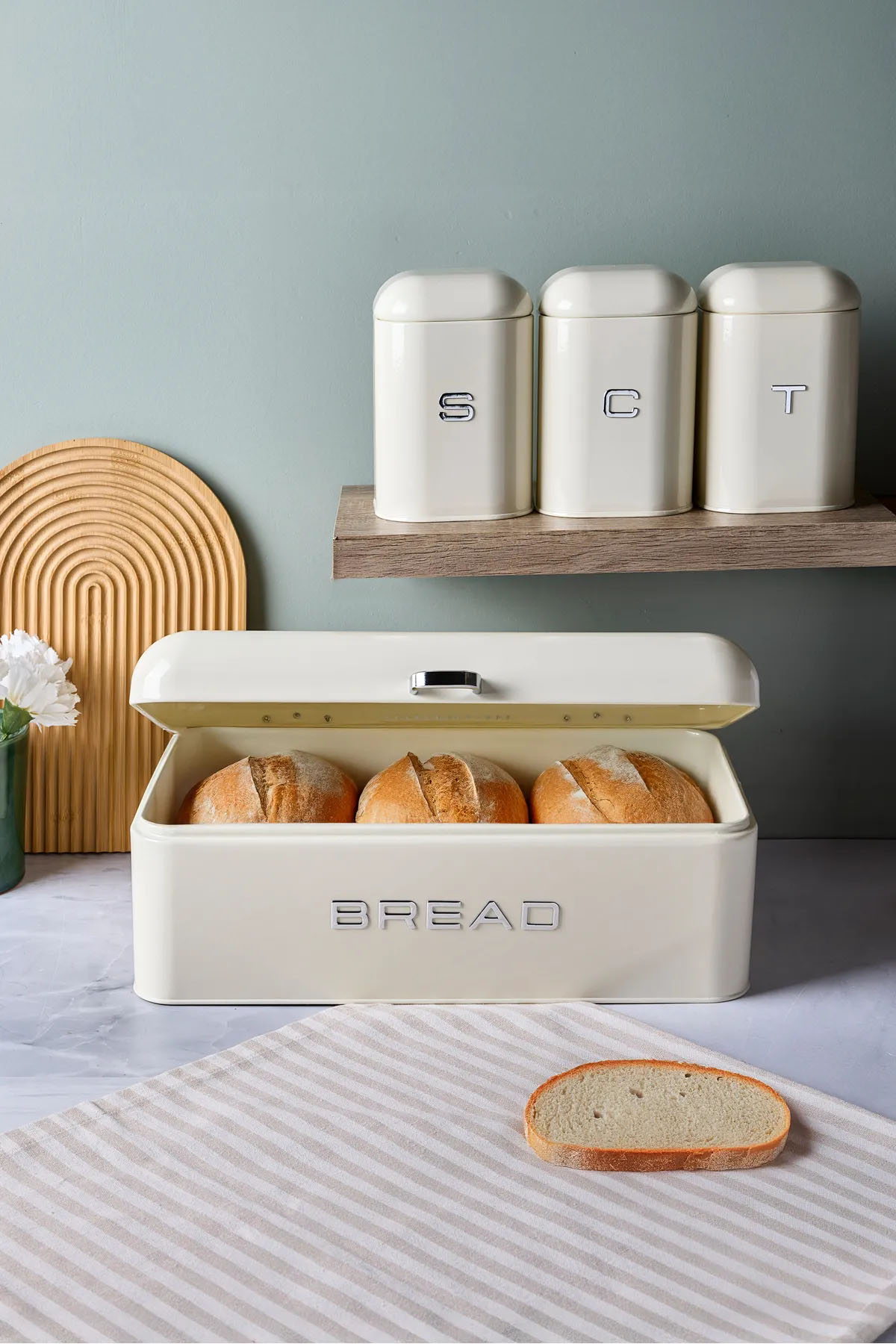 Mutfak düzeninizi pratik ve şık bir şekilde tamamlayacak krem rengi saklama seti, ekmek kutusu ve üç farklı boyutta saklama kabından oluşur. Gıda tazeliğini korumaya yardımcı olan dayanıklı yapısıyla, yiyeceklerinizi güvenle muhafaza ederken, modern tasarımı mutfağınıza zarif bir dokunuş katar.